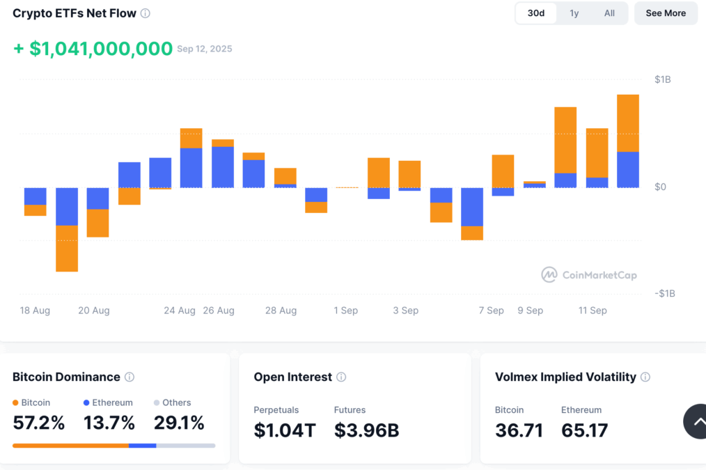 加密货币ETF市场9月12日实现10.4亿美元净流入,逆转本月早前流出趋势。永续合约未平仓量达1.04万亿美元,表明杠杆交易活跃,此类头寸通常加剧市场波动。