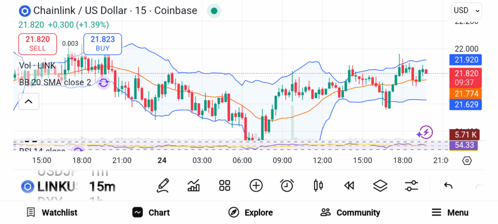 Chainlink代币LINK在经历小幅周回调后现报21.74美元,但整体表现依然亮眼。该代币近期涨幅达90%,交易所储备创历史新高与鲸鱼持续吸筹形成支撑。过去一周大额持币地址增持约80万枚LINK,交易所供应量因用户转向自托管而降至历史低点。