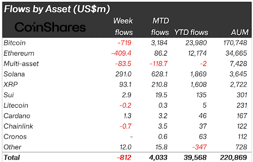 加密货币基金的资金流向显示,机构投资者上周大幅抛售了比特币和以太坊。与此同时,瑞波币(XRP)和Solana(SOL)成为少数实现资金净流入的山寨币。