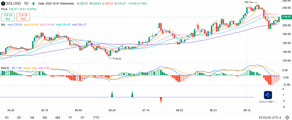 Solana现报219.47美元,日内涨幅5.07%,在触及200美元附近低点后延续反弹走势。该代币此前从252.74美元高点回落,现已在关键支撑位重获上涨动能。本轮反弹表明市场参与度回升,短期技术结构得到强化。