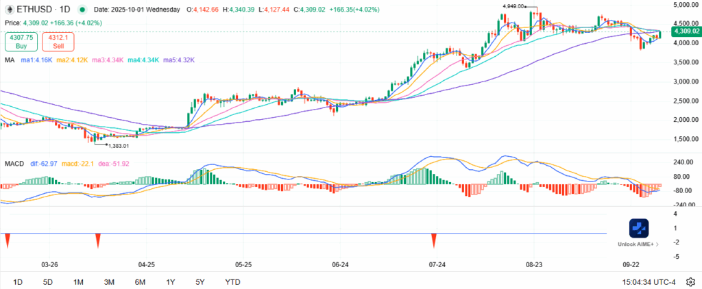 以太坊现报4309美元,自4000美元支撑区域反弹后录得4.02%涨幅。虽然从4949美元高点回落,但该代币始终保持在强势看涨框架内整理。这一阶段既标志着市场重归稳定,也为后续延伸行情奠定基础。