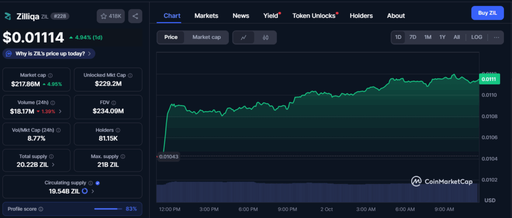 CoinMarketCap数据显示,截至发稿时Zilliqa(ZIL)交易价格为0.01114美元,24小时涨幅4.94%。该代币早盘从0.01043美元附近启动后于午间强势拉升,形成稳定上升的日内波动形态。图表显示其价格整固于0.011美元区间,全时段维持上涨态势。