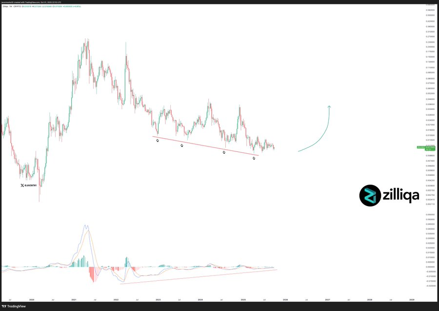 当前图表分析基于历史结构指出Zilliqa两个潜在复苏目标:第一目标位0.038美元(较当前低位涨幅超240%),更长远目标看至0.15美元(涨幅逾1100%)。该预测结合了下行支撑线的稳定性与MACD指标内的看涨背离信号。
