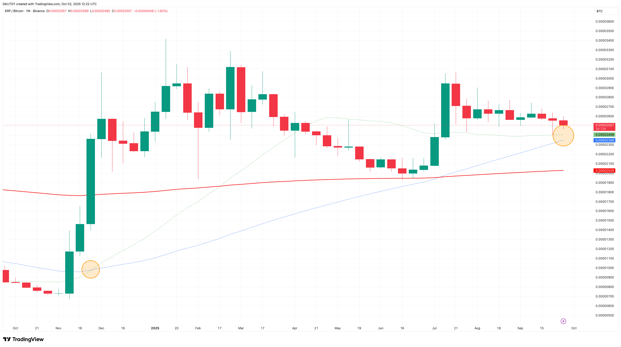 该信号上次出现在XRP/BTC交易对时,曾推动价格在2024年11月至2025年2月期间实现112%的暴涨。