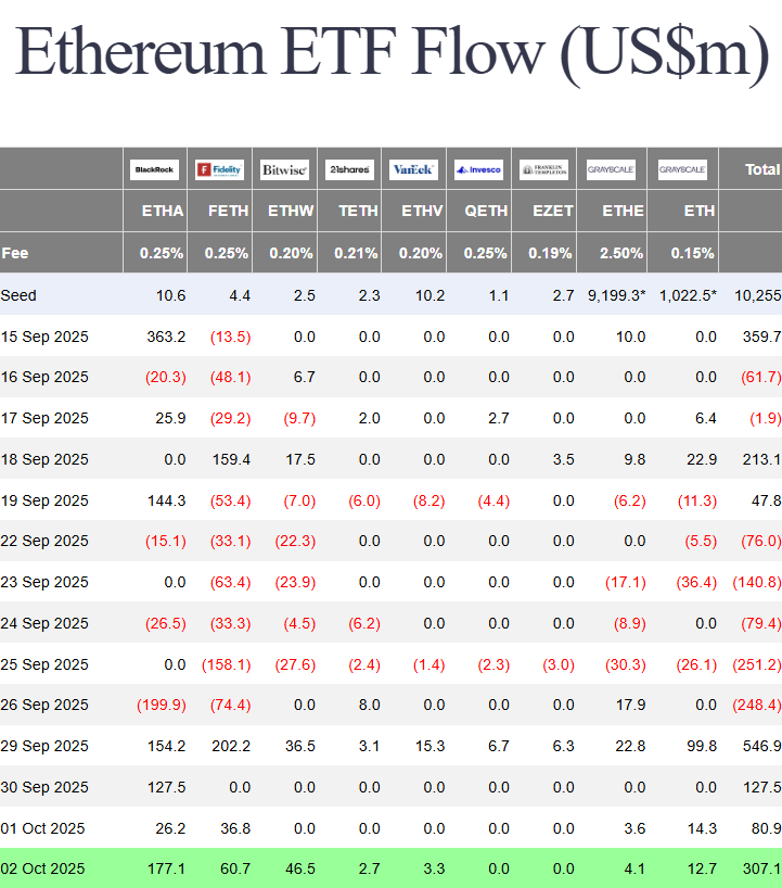 即便在9月末加密货币普涨行情中,以太坊ETF表现仍显疲软。虽然上周连续三个交易日保持净流入,但总规模不足1亿美元。而周四单日3亿美元的流入量,无疑为市场注入强心剂。