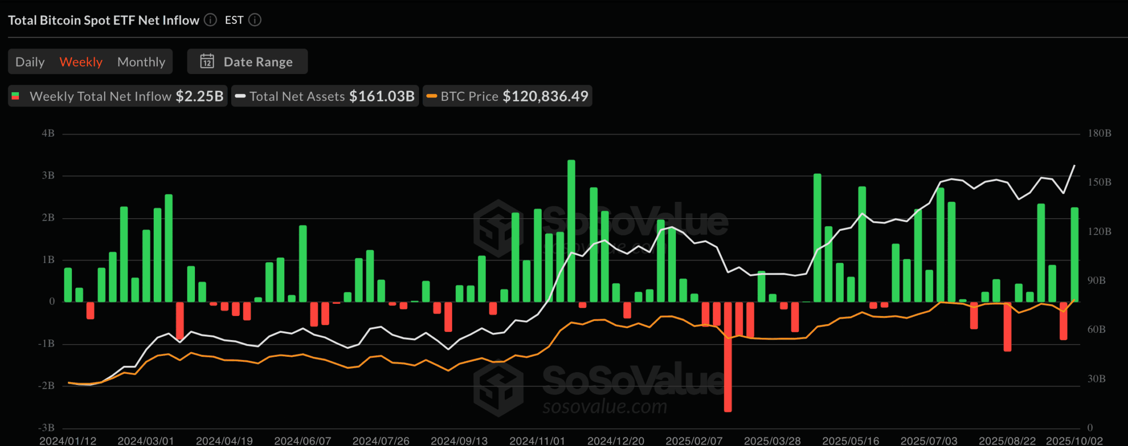 据SoSoValue数据显示,继9月净流出近10亿美元的震荡行情后,本周比特币ETF实现22亿美元资金净流入。
