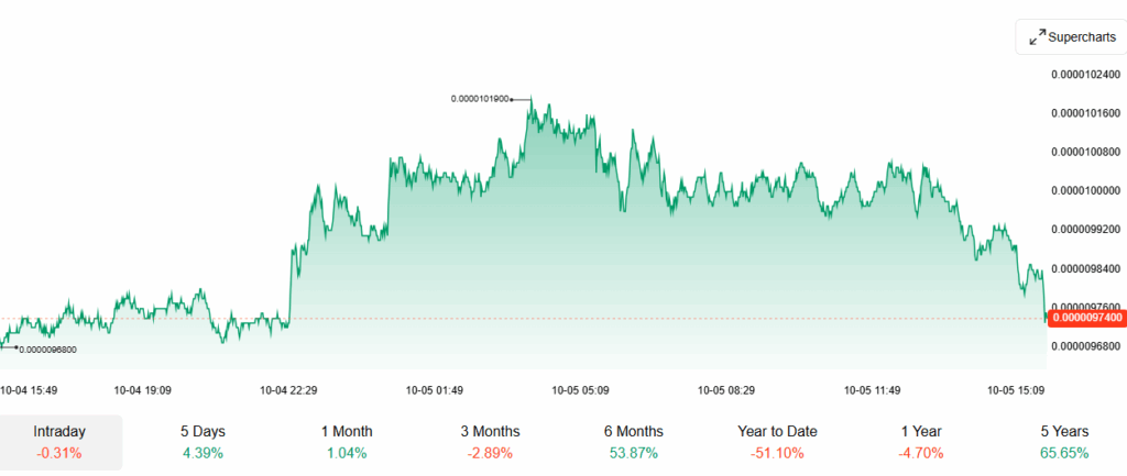 狗狗币现报0.00000974美元,日内微跌0.31%,显示近期上涨后的短期调整。过去五日该代币累计上涨4.39%,表明在收窄的波动区间内仍存在持续买盘。尽管半年涨幅达53.87%,但受年初市场普跌拖累,其年内表现仍显疲软。
