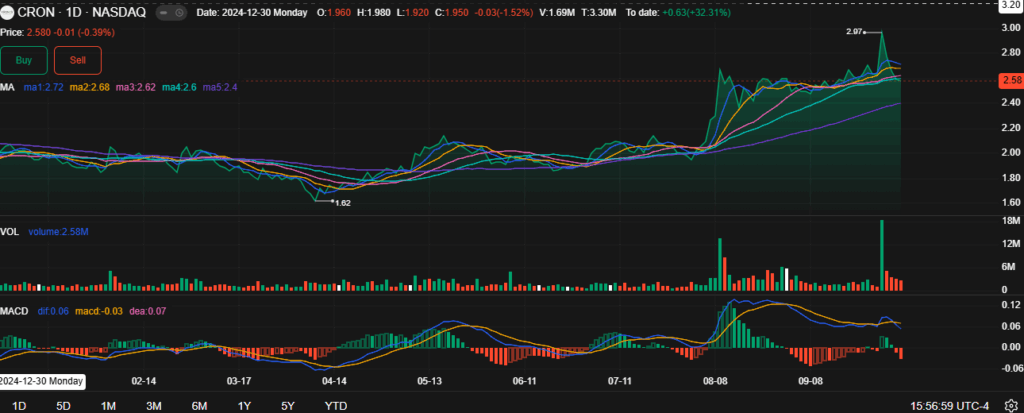 纳斯达克上市的Cronos现报2.58美元,在从1.82美元飙升至2.97美元峰值后进入整理。该股年内涨幅保持32%,反映大麻相关股票市场的持续结构性复苏。但成交量萎缩与MACD指标走平,表明持续上涨周期后动能减弱。