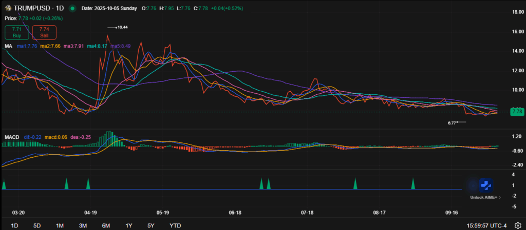 TRUMPUSD现报7.78美元,在从4月18.44美元高位暴跌后首次显现企稳迹象。图表显示均线走平与MACD底背离,均暗示下跌动能减弱。该代币在7.70美元附近的波动,反映长期疲软后买卖力量可能达到平衡。