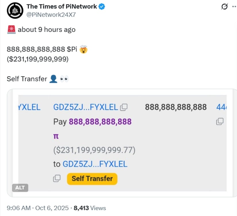 记录显示发生价值2310亿美元的8880亿Pi自转账,后经确认为测试网压力测试,非真实主网交易。来源:The Times of PiNetwork/X