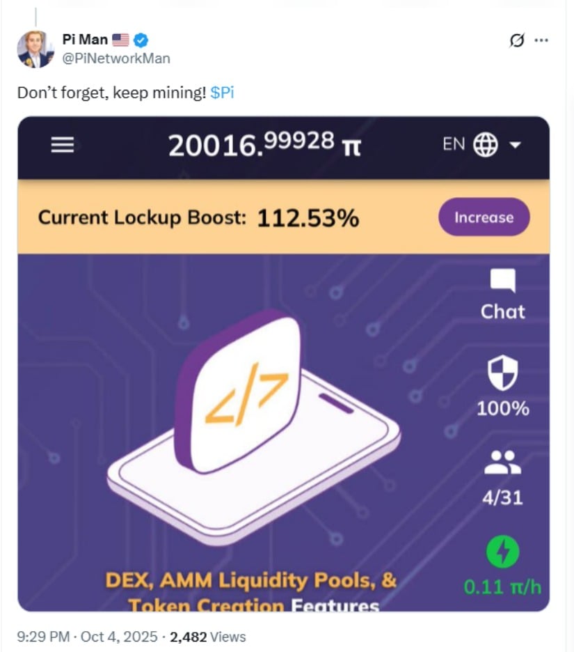 鉴于社区信心仍聚焦长期增长,建议投资者继续挖矿Pi币。来源:Pi Man/X