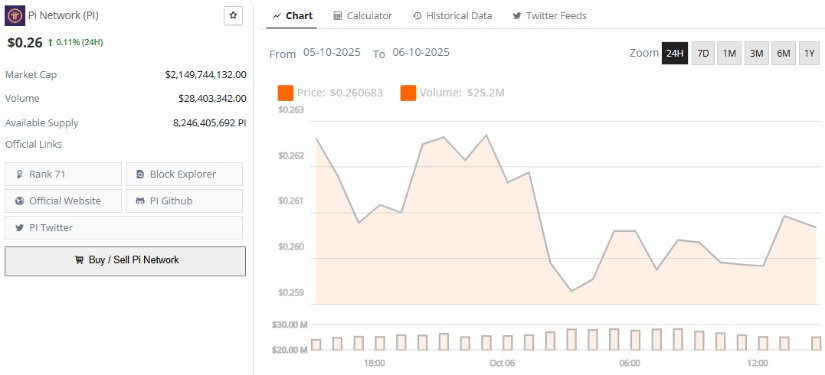 截至发稿,Pi Network交易价约0.26美元,24小时微涨0.11%。来源:Brave New Coin