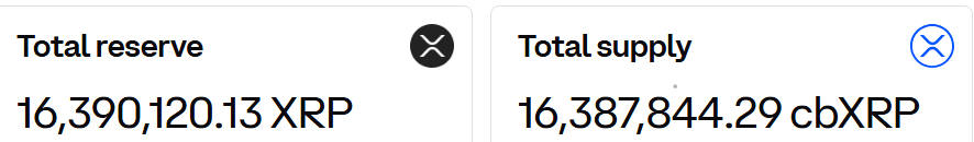 两周后,该平台的XRP持仓进一步缩水至约3200万枚。目前Coinbase储备中仅存约1639万枚XRP,Base链上封装版XRP(cbXRP)总量也维持在约1638万枚。