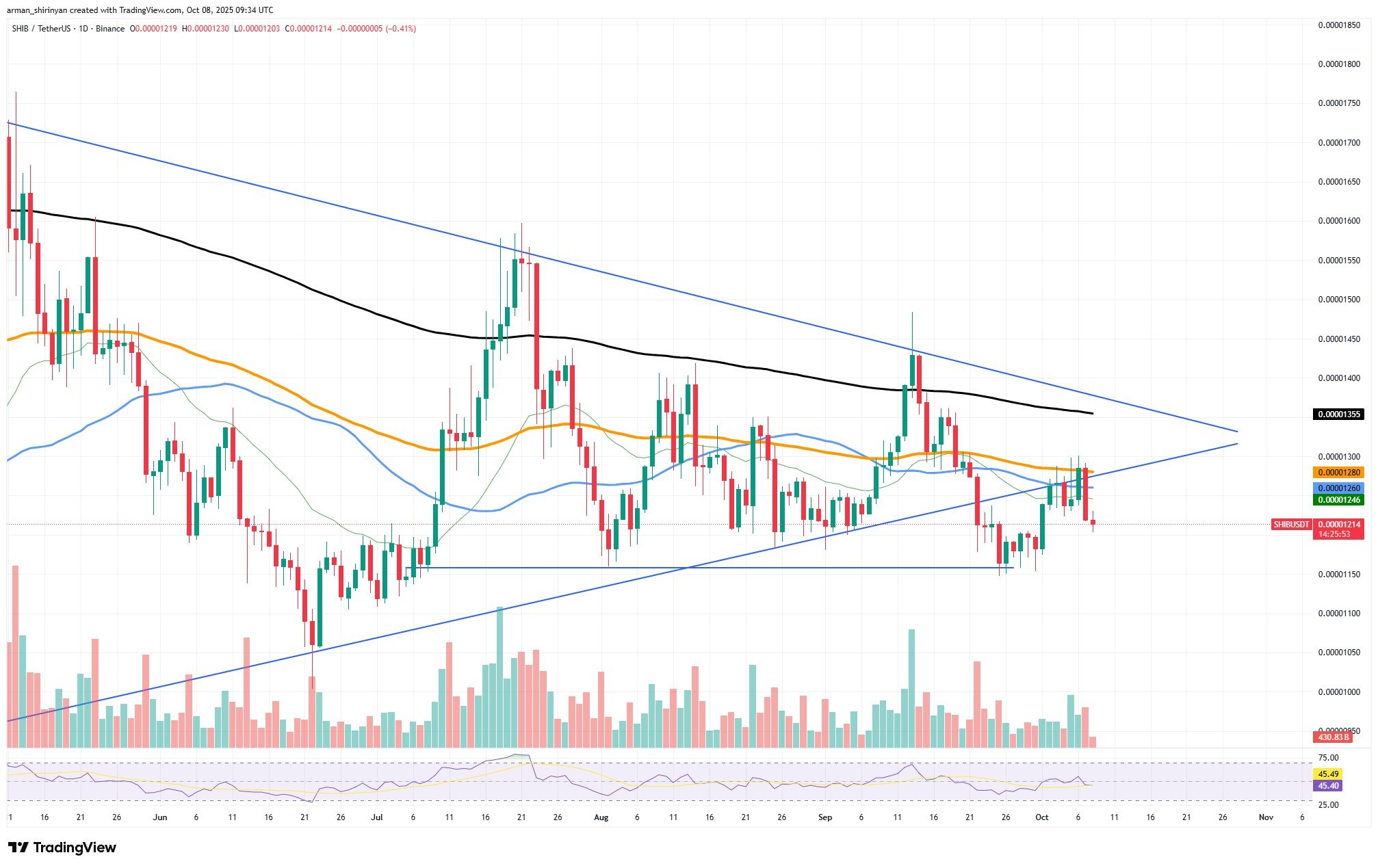 从技术面看,SHIB走势图仍显脆弱。该代币当前勉强维持在0.0000121美元的主要上升支撑区上方。尽管多次尝试反弹,市场仍受制于200日均线构成的长期对称三角形形态,且0.000135美元阻力位持续压制价格。每次反弹都遭遇快速抛售,表明巨鲸正在持续派发筹码。