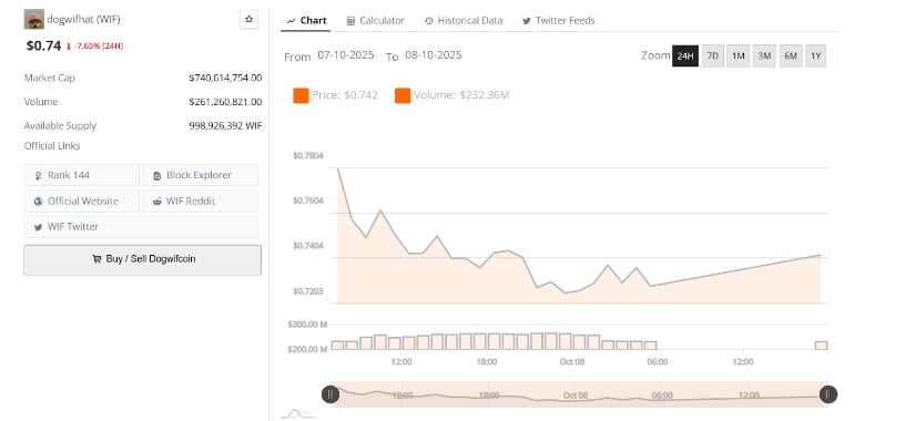 Dogwifhat过去24小时下跌7.65%,现报0.74美元附近,市值7.406亿美元。24小时交易量2.612亿美元,显示价格下跌中仍有参与。2025年10月7日至8日盘中数据显示,该资产开盘报0.78美元后回落至0.72美元,尾盘小幅反弹。