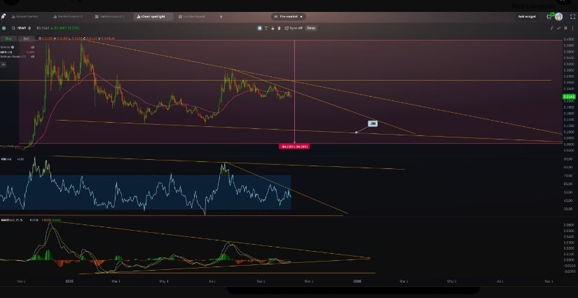 尽管中期形态显示乐观信号,但另一位分析师警告称,日线图上的短期结构呈现看跌倾向。分析指出在0.22美元阻力区下方正在形成下降三角形,这种形态通常意味着买方信心减弱,特别是当价格多次上攻失败时。该分析师表示,若跌破下边界可能引发跌向0.09美元的走势,意味着若空头占优将存在34%的下行风险。