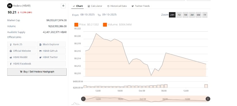 HBAR当前市值90.5亿美元,稳居加密货币市值前25位。流通供应量约424亿枚代币。从技术面看,0.22美元已成关键阻力位,而0.20美元和0.18美元支撑位继续构筑价格锚点。若强势收于0.22美元上方可能吸引新买盘,反之跌破0.20美元或将确认看跌延续。