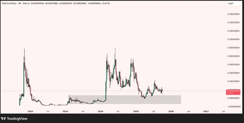 随着长期支撑区买盘压力增强,FLOKI在0.00009美元附近展现出新的稳定性。分析师"北方黑猩猩"指出,该代币正重返历史吸筹区间,周线图上通常被标记为"买入区域"。该分析师认为此区域是此前市场周期在长期上涨前筑底的位置。
