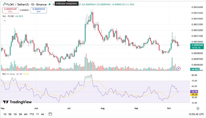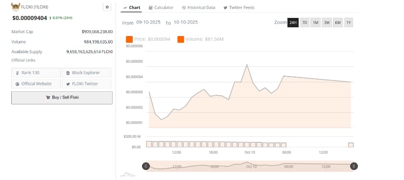 FLOKI 24小时交易量约8419万美元,显示市场参与者持续参与。代币市值达9.09亿美元,稳居加密货币总价值前130名。稳定的价格走势表明尽管大盘波动,投资者仍保持信心。