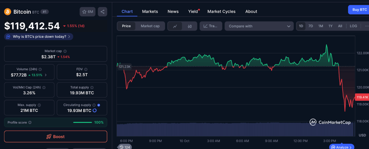 市值最大的加密货币比特币较日内高点下跌1.55%,跌幅虽小却引发主流币种集体跟跌。在10月6日创下12.6万美元历史新高后,随着投资者获利了结,比特币现已回吐全部涨幅。根据CoinMarketCap数据,发文时比特币报价119,412美元,24小时交易量达777.2亿美元。