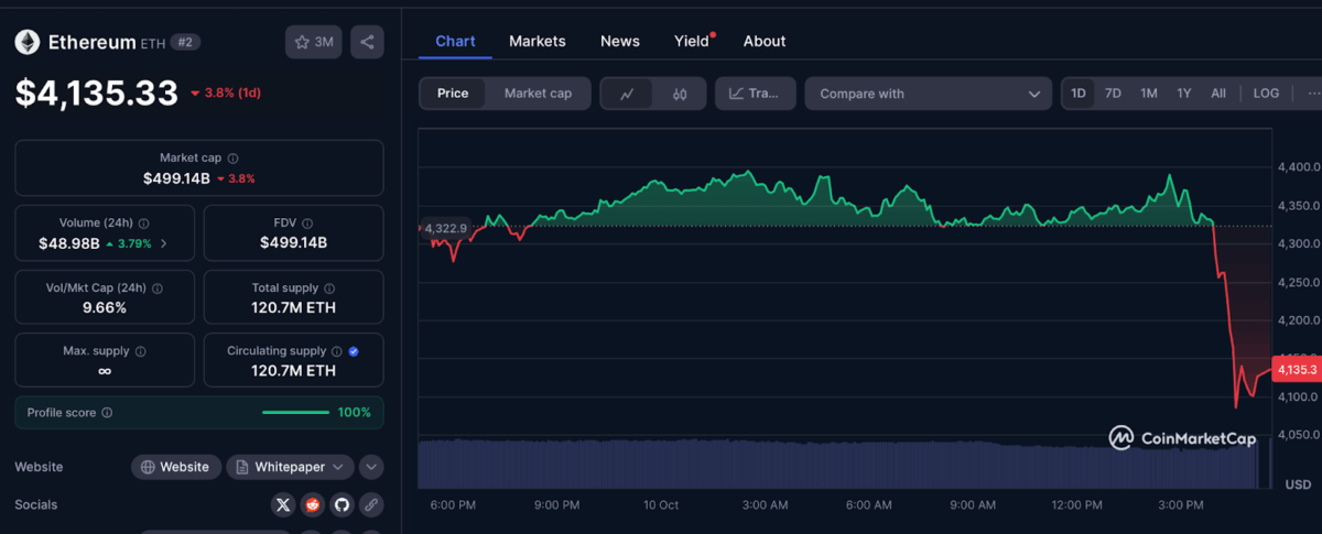 以太坊在巨量卖盘冲击下暴跌近4%。伦敦时段早盘ETH尚维持在4,300-4,400美元区间,但随后行情急转直下,迅速跌破4.1万美元关口。截至撰稿,ETH报价4,135美元,市值缩水至4990亿美元附近。值得关注的是,ETH在10月7日曾触及4,700美元周内高点,距历史峰值仅差5%。