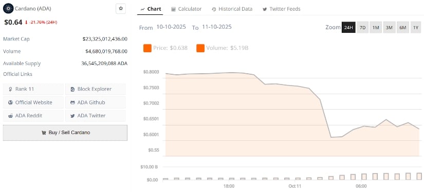 卡尔达诺价格遭遇猛烈抛售,过去24小时内跌幅超21%至0.64美元附近。这波行情连续击穿0.72美元和0.68美元多重支撑位,仅耗时数小时。成交量激增至46亿美元以上,显示市场出现恐慌性出逃和杠杆仓位连环清算。