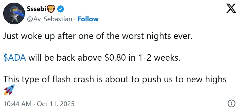 尽管暴跌,卡尔达诺持有者仍保持信心,分析师预计将快速反弹至0.80美元。数据来源:Sssebi via X
