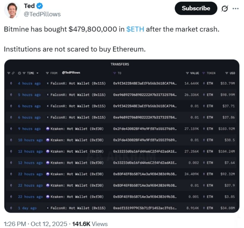Bitmine在市场暴跌后扫货4.8亿美元ETH,显示机构对以太坊信心未减。来源:@TedPillows via X