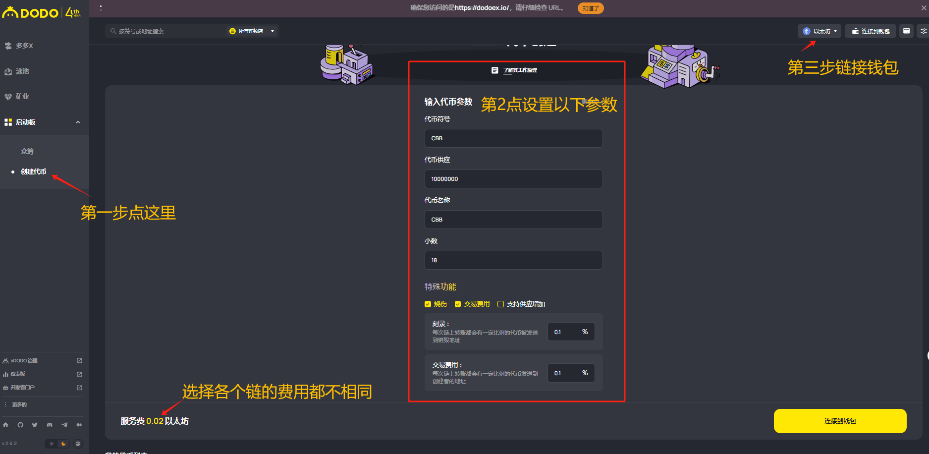 第二步:设置币种名称,总量和小数,可选择性设置燃烧机制与链上转帐交易费用。再链接钱包形成合约地址。