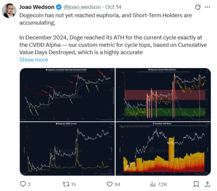 狗狗币尚未进入狂热阶段,短线持有者的持续积累暗示,历史链上模式与指标支持其近期价格上行潜力。来源:Joao Wedson(X平台)