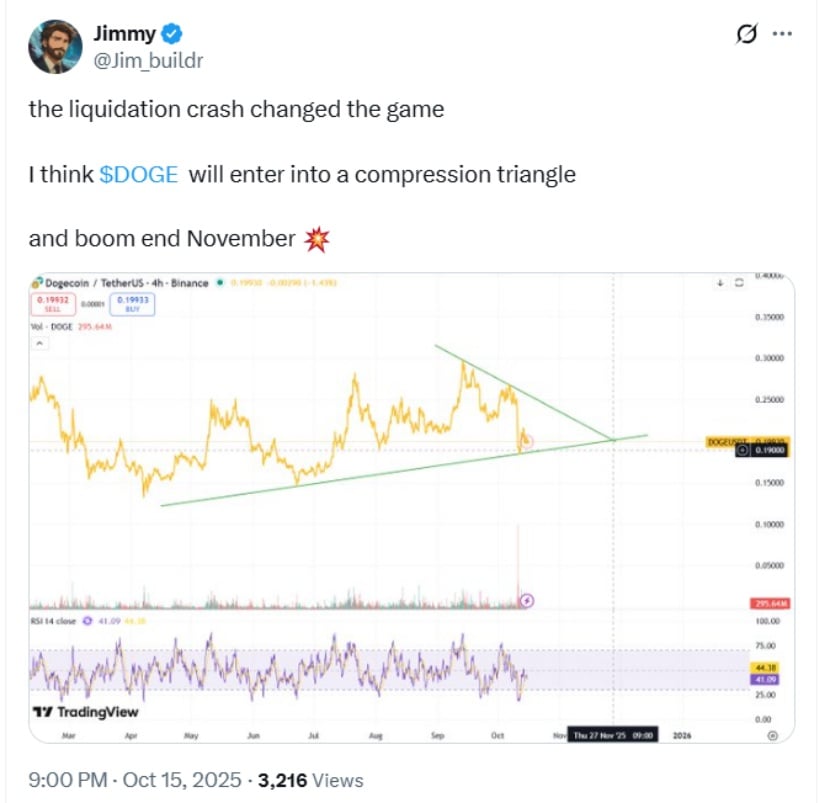 经历清算危机后,狗狗币(DOGE)形成压缩三角形态,暗示突破前的盘整阶段,11月底可能出现看涨飙升。来源:Jimmy(X平台)