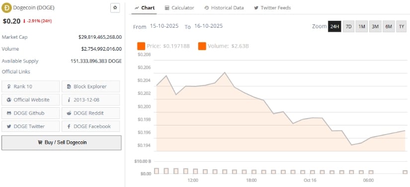 截至发稿,狗狗币交易价约0.20美元,24小时跌幅2.91%。来源:Brave New Coin