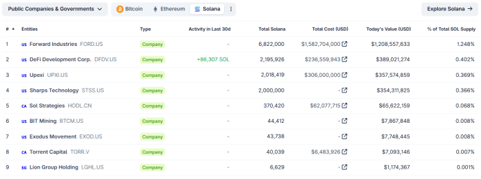 其中Forward Industries持仓量最大(682万枚SOL,现值约12亿美元),DeFi Development Corp以219万枚SOL(3.89亿美元)紧随其后,Upexi持有200万枚SOL(3.575亿美元)。