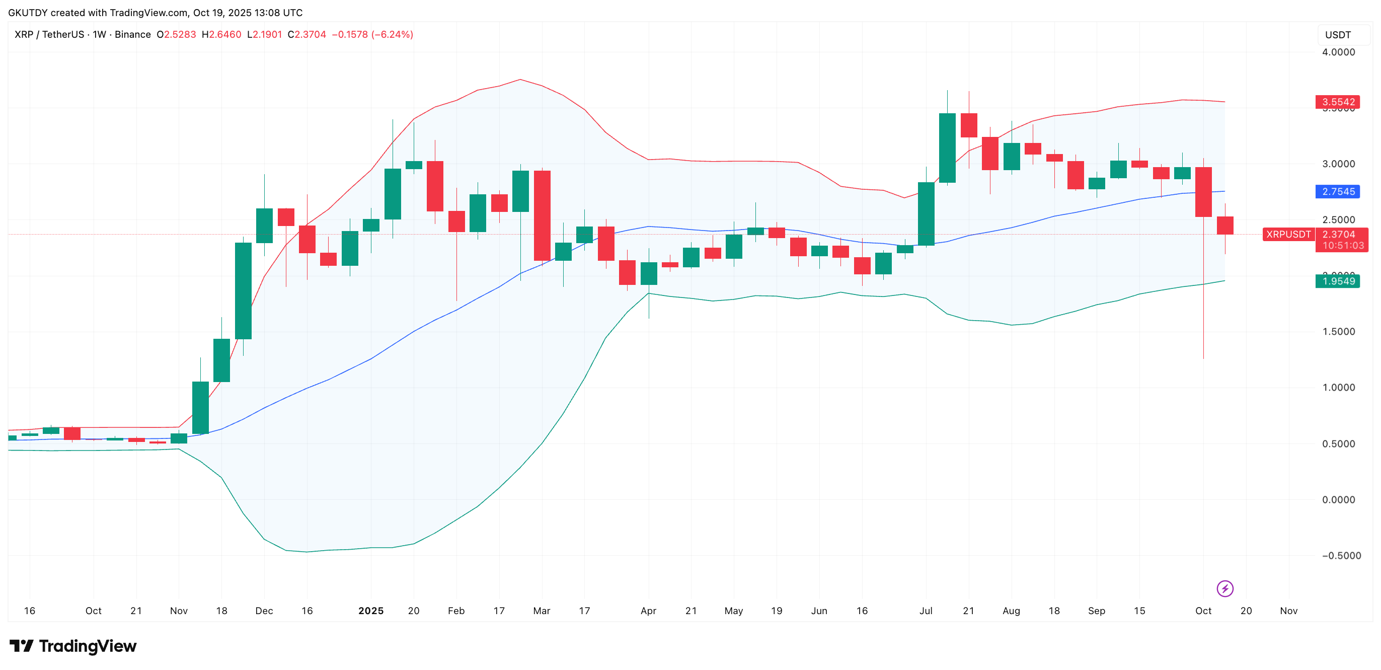 就在不久前,XRP还舒适地栖息在3.58美元的上轨区域,如今同一指标却暗示1.95美元才是合理价位。除非买家能迅速夺回中轨控制权,否则将2美元视为可靠底部终将沦为怀旧谈资,而非严谨的基本面分析。