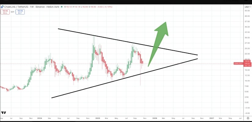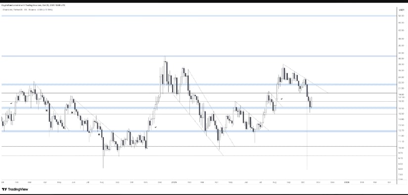 根据Satoshi Flipper的周线分析,该资产自2023年中以来始终坚守上升趋势线支撑。持续的横盘整理构筑了结构性底部,这种形态通常出现在市场大幅扩张前的吸筹阶段。若突破上轨且看涨动能延续,价格目标可看至30美元附近。