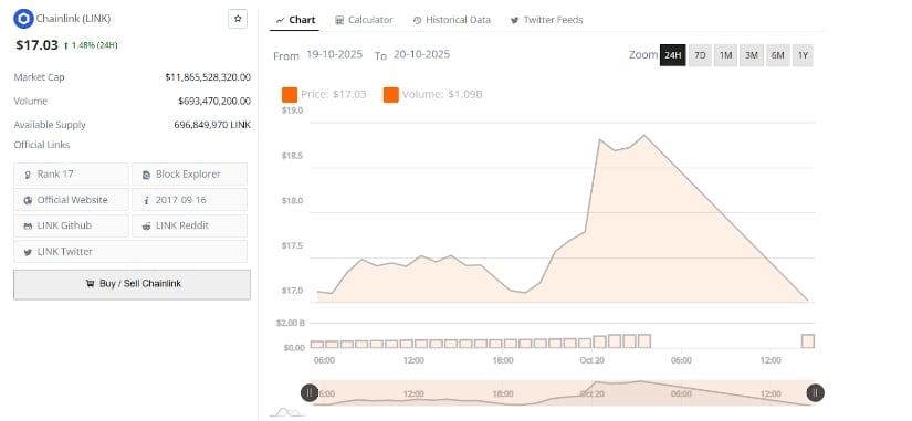 Chainlink现报17.03美元,24小时涨幅1.48%。成交量激增至6.934亿美元,显示关键技术位附近参与度提升。当前市值118.6亿美元,稳居加密货币市值排行榜第17位。交易活跃度增加佐证了交易者正在为潜在突破布局。