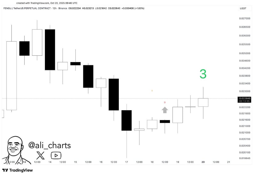 PENGU触发TD序列买入信号,预示数周盘整后新的看涨动能正在形成。来源:Ali Martinez via X