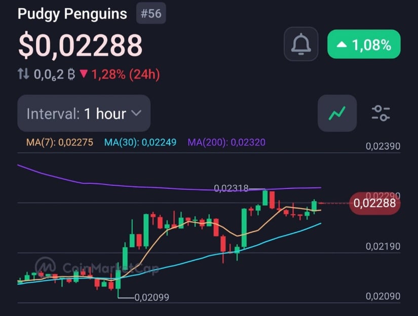 PENGU在0.0228美元附近盘整,7日与30日均线形成金叉,暗示看涨反转可能。来源:Olki via X