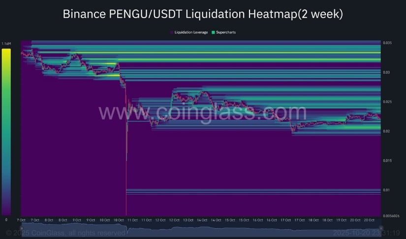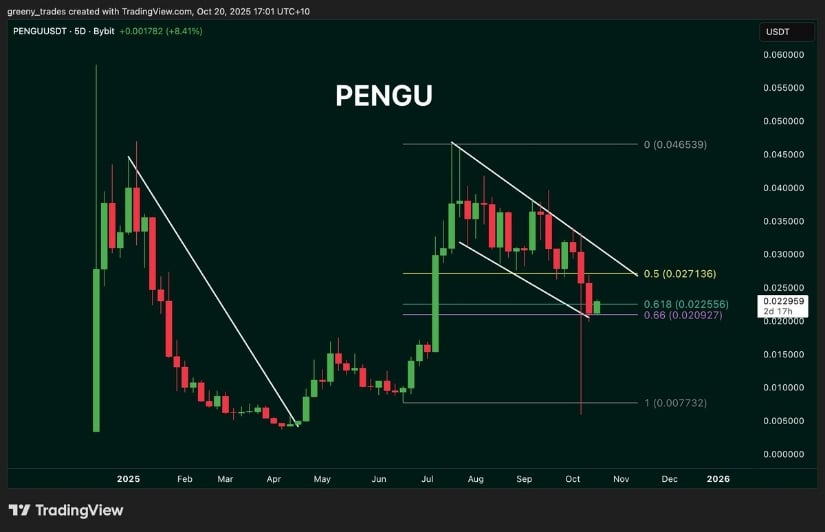 分析师Greeny分享的最新市场结构显示支撑区域得到有力防守,为进一步复苏奠定基础。PENGU始终坚守0.618-0.66斐波那契黄金口袋(0.0209-0.0225美元关键支撑区)。图表同时显示价格正尝试突破下降通道,预示买方动能可能即将占据主导。