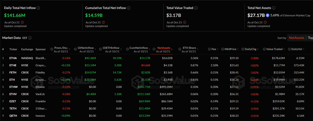 所有以太坊ETF单日跌幅介于3.82%-4.15%。ETHA报29.10美元,ETHE收于31.63美元,FETH收盘价38.41美元。成交量分化明显,ETHA成交615万份,ETH成交55.2万份,显示主流以太坊基金交投活跃。