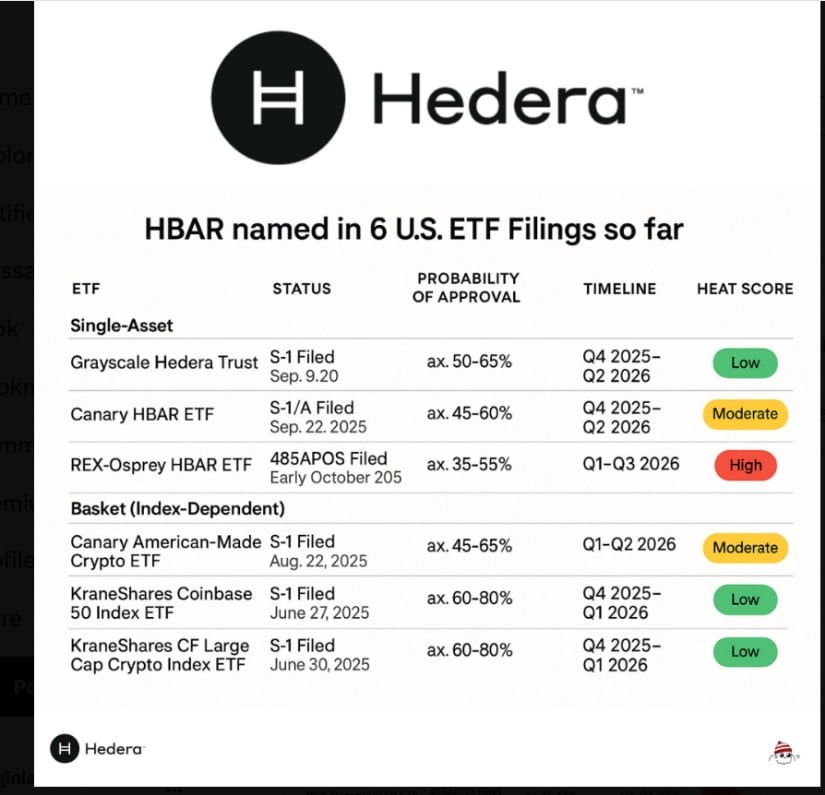 分析师报告预估,2025年第四季度前至少一支HBAR关联ETF获批的概率达60%-80%。此进展延续了比特币和以太坊ETF获批带来的市场动能,标志着投资者对多元化数字资产组合的关注扩展。该趋势可能为资产引入更广泛流动性,降低传统投资者参与门槛。