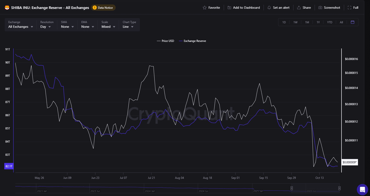 但单日流入数据不能反映全貌。图表显示柴犬币交易所储备自五月以来持续下降,从当时的约90.5万亿枚SHIB缩减至当前水平。
