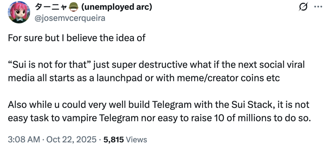 对此,Move 生态 Web3 解决方案提供商 IPX Labs 成员,也是 Sui 生态 meme/launchpad 专案开发者,X handle 为 @josemvcerqueira 的用户表示了赞同,并委婉地表示 Sui 也存在与以太坊生态类似会根据自身喜好来判断专案好坏的问题。