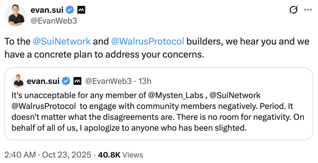 在意识到团队成员说了一些不该说的话之后,Sui 联创兼执行长 Evan Cheng 出面表示向所有被轻视的人道歉并称无论分歧是什么,Mysten Labs、Sui 与 Walrus 的任何成员与社群进行消极的沟通都是不被允许的。之后,Evan Cheng 表示将向 Sui 和 Walrus 的建设者提供具体的计划来解决问题。