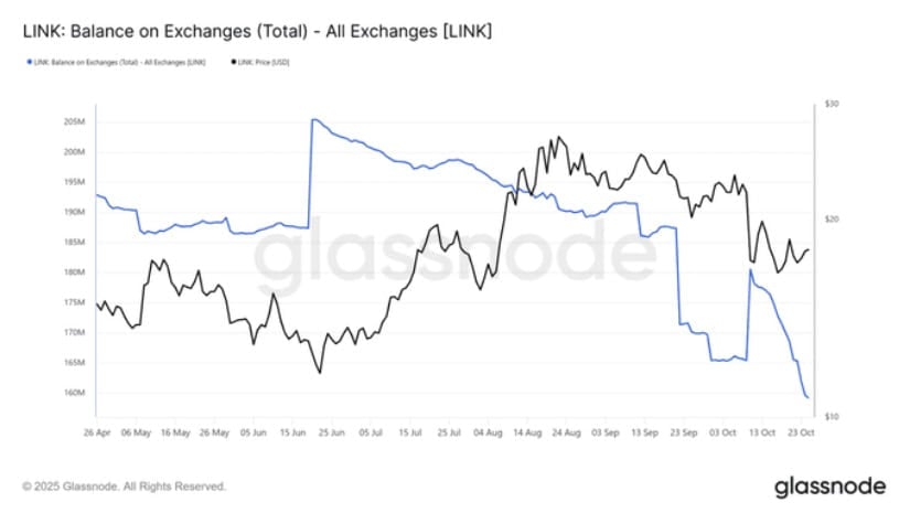 Tom Tucker在X平台分享的链上分析显示,Chainlink持有者正呈现强劲的囤币趋势。根据Glassnode图表蓝线所示,自十月中旬以来交易所资产余额急剧下降。这种模式通常意味着持有者正将代币从交易所转移至冷钱包,既减轻抛压也表明对其长期前景信心增强。
