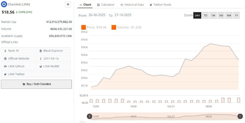 BraveNewCoin数据显示Chainlink现报18.56美元,24小时上涨3.04%,市值达129.1亿美元。同期交易量约6.684亿美元,流通供应量6.968亿枚。该代币稳居加密货币前20名,展现出强劲流动性和持续投资者兴趣。