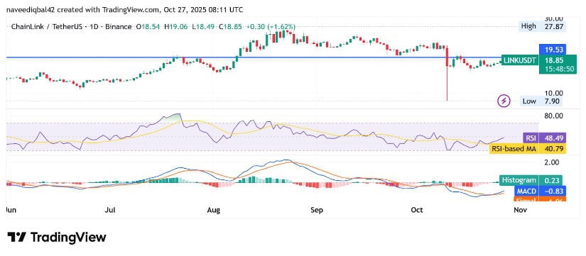 截至10月27日,TradingView数据显示LINK/USDT交易于18.88美元,日内涨幅1.78%。日线图显示19.53美元为关键阻力位,该价位曾多次引发价格反应。维持在18.20-18.40美元支撑区间上方对当前上涨趋势至关重要。