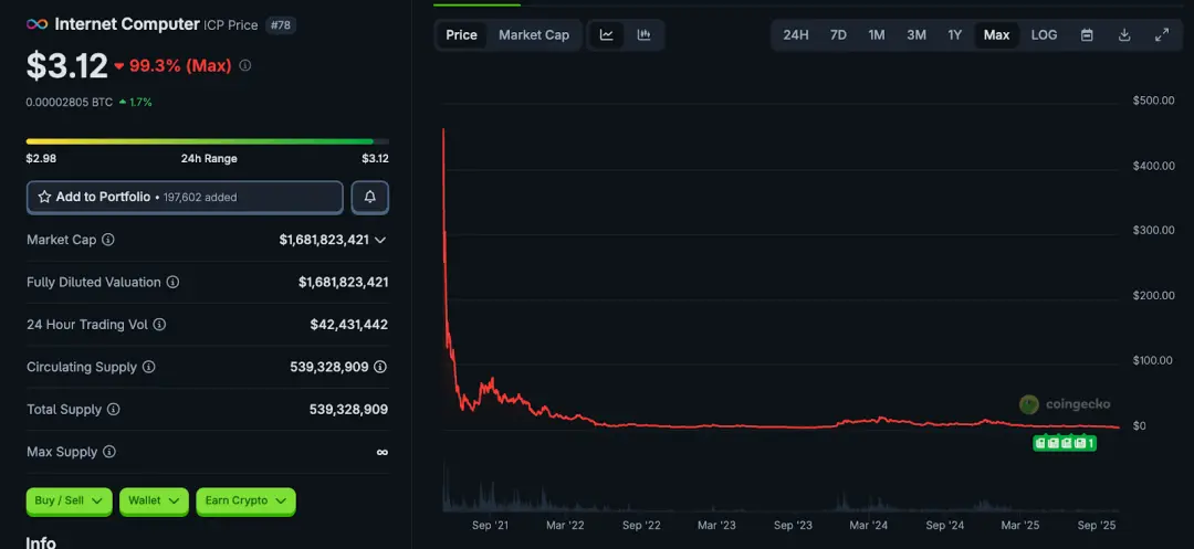 ICP 背后聚集了顶级硅谷风投,包括 a16z、Polychain Capital、Multicoin、CoinFund 等,累计融资达 1.87 亿美元。ICP 初始价格高达数百美元,峰值一度接近 700 美元,但在上线后迅速回落,两个月内跌破 20 美元。截至 2025 年,ICP 长期徘徊在 3 美元左右,较高点下跌超 99%。