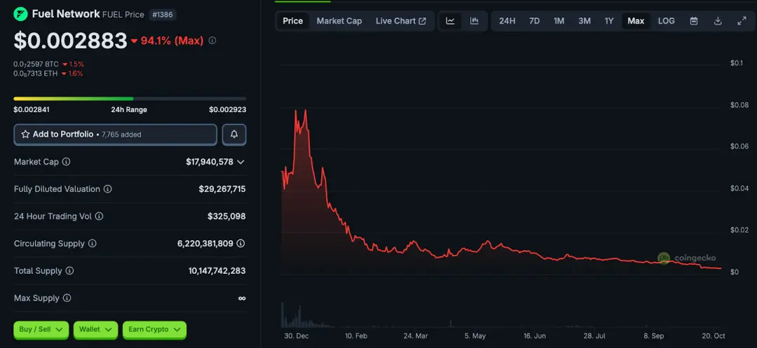 然而,在代币表现与生态落地上,Fuel Network 并未兑现预期。FUEL 当前价格约为 0.003 美元,市值仅千万美元,高点下跌超 94%。以太坊扩容、各种 L2、模组化链方案层出不穷,Fuel 的差异化优势能否长期维繫尚存疑问。