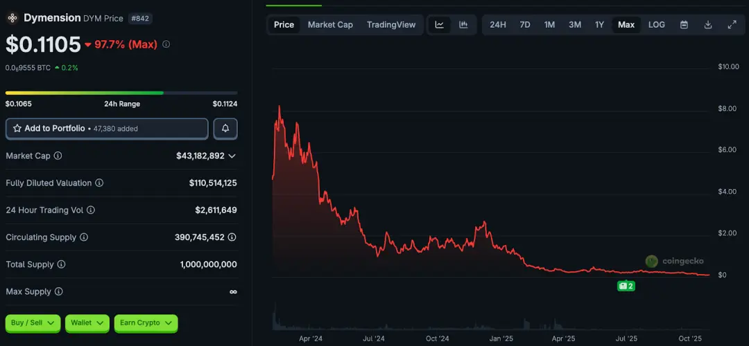 项目启动于 2022 年,2024 年年初上线代币 DYM。儘管技术定位明确、背后获得 Big Brain Holdings、Stratos、Cogitent Ventures 等多家投资机构支持,但从市场表现来看,DYM 当前价格已较峰值下跌逾 97% 以上。据数据显示,其历史高点接近约 $8.50,现价处于约 $0.10 美元区间。项目当前虽仍在运行,但生态化进展缓慢,社群与用户参与度未达到预期。